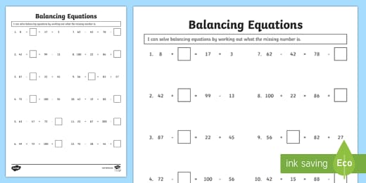 Students practice balancing equations and apply their understanding of missing parts.